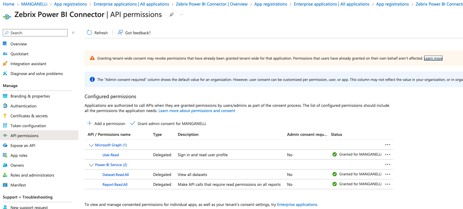 - The user will need to authenticate and to give the permissions to zebrix to access to his power bi reports.