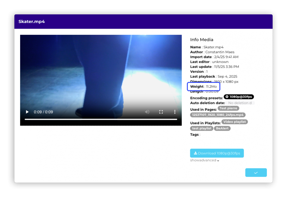 Si la qualité d’un fichier vidéo est trop élevée ou que le format n’est pas optimisé, Zebrix optimise automatiquement la taille du fichier en le compressant (sans perte visible de qualité). Grâce à ce processus, la taille d’une vidéo peut être divisée par 2 à 10 selon les caractéristiques du fichier original.