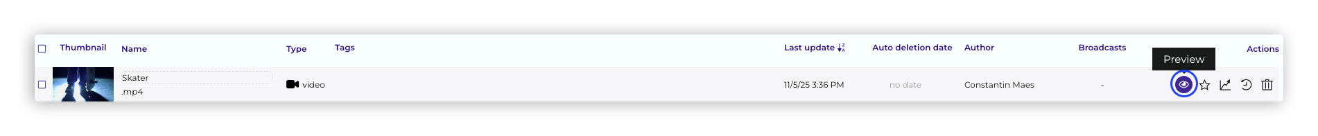 Dans Zebrix, vous pouvez consulter la taille des fichiers dans la fenêtre d’aperçu accessible depuis les sections média, page et playlist de Zebrix en utilisant l’icône suivante :