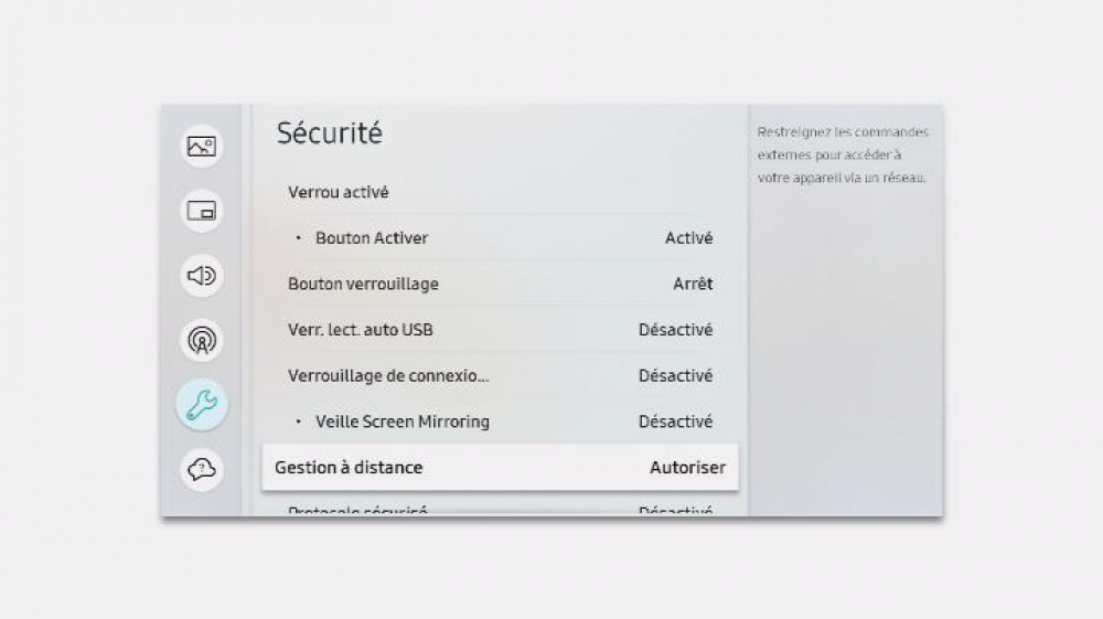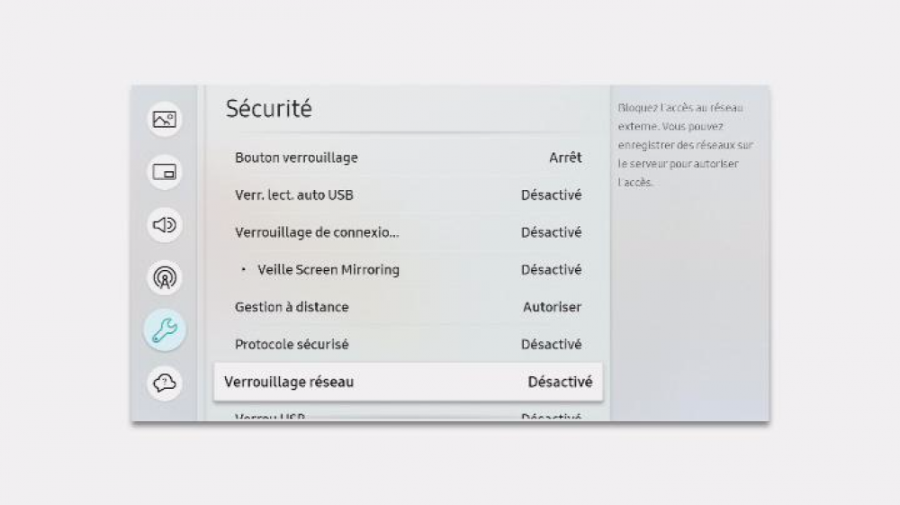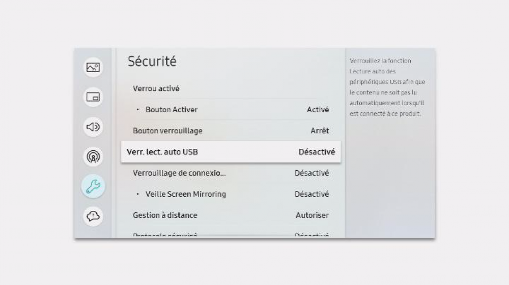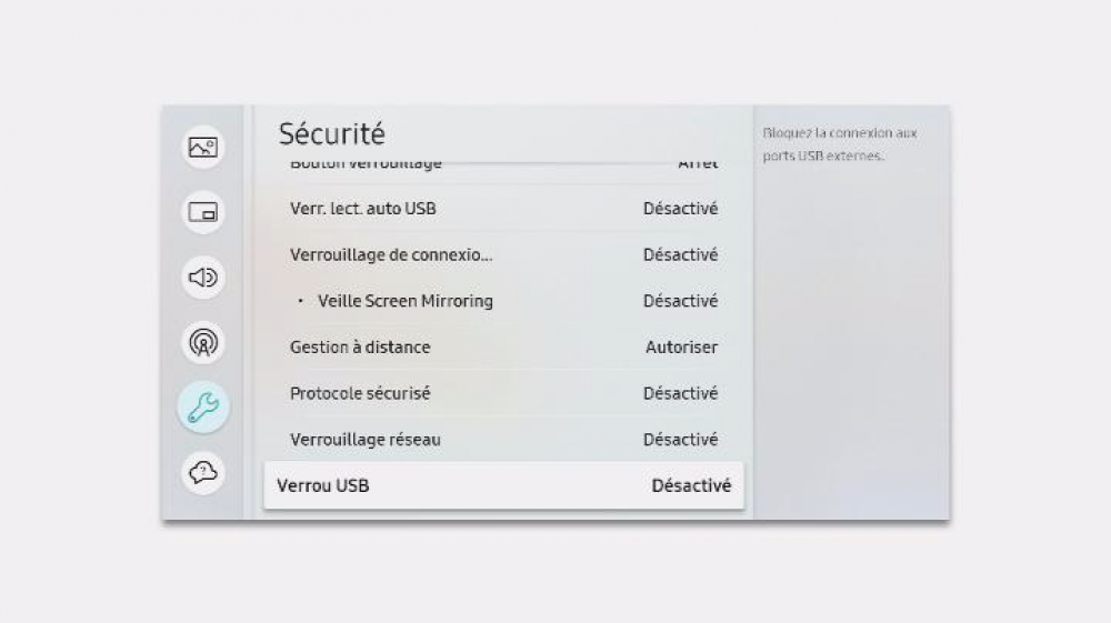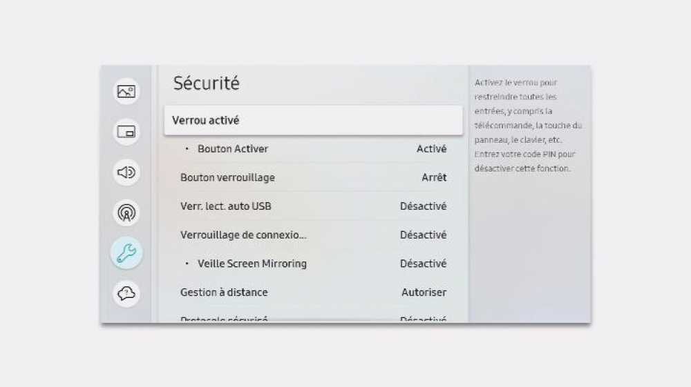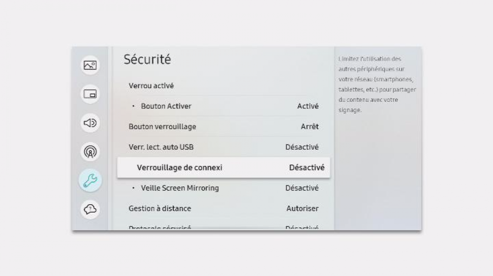 Il est possible de contrôler plusieurs paramètres de sécurité sur les écrans Tizen : désactivation des ports USB, mise en place d'un code PIN, désactiver le bouton d'alimentation, etc…