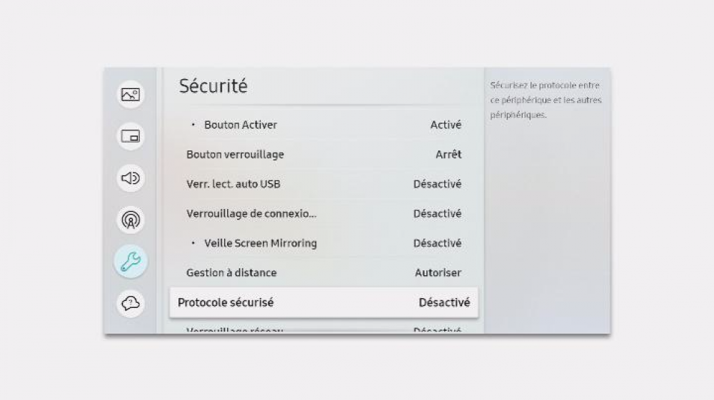 Ce guide détaille chaque fonction de sécurité des écrans Tizen, certaines options ne seront pas disponibles selon le modèle de votre écran, n'hésitez pas à nous faire remonter l'information si vous découvriez un manque.